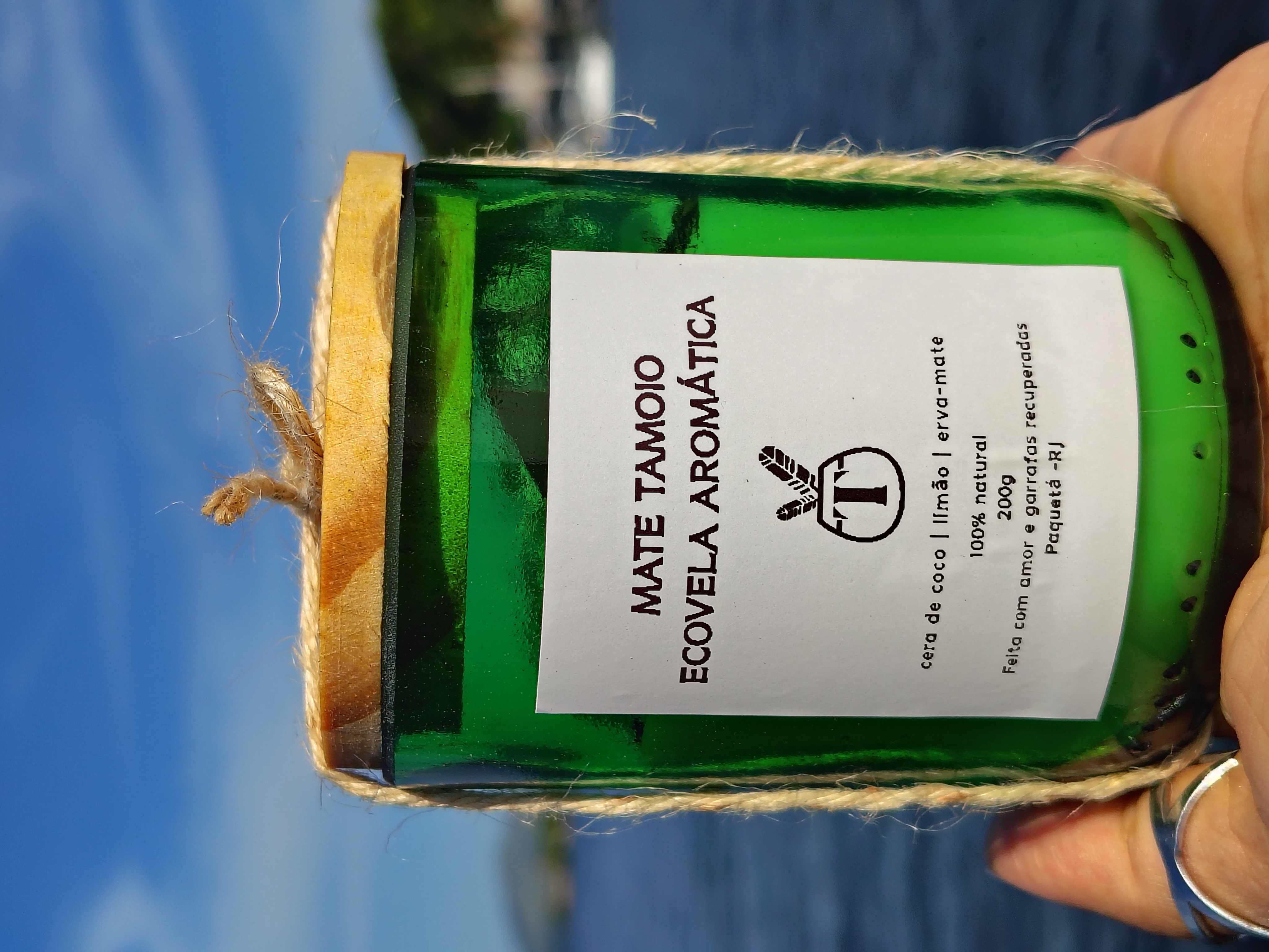 Eco vela artesanal feita a partir de garrafas de vidro recicladas, reaproveitadas de forma consciente. Produzida com cera vegetal e aroma natural de mate e limão, cria uma ambientação fresca, acolhedora e com identidade carioca. Cada peça é única e representa a economia circular e o impacto socioambiental positivo do Lab Mate Tamoio. Disponível para varejo e atacado, ideal para decoração, eventos e brindes sustentáveis.